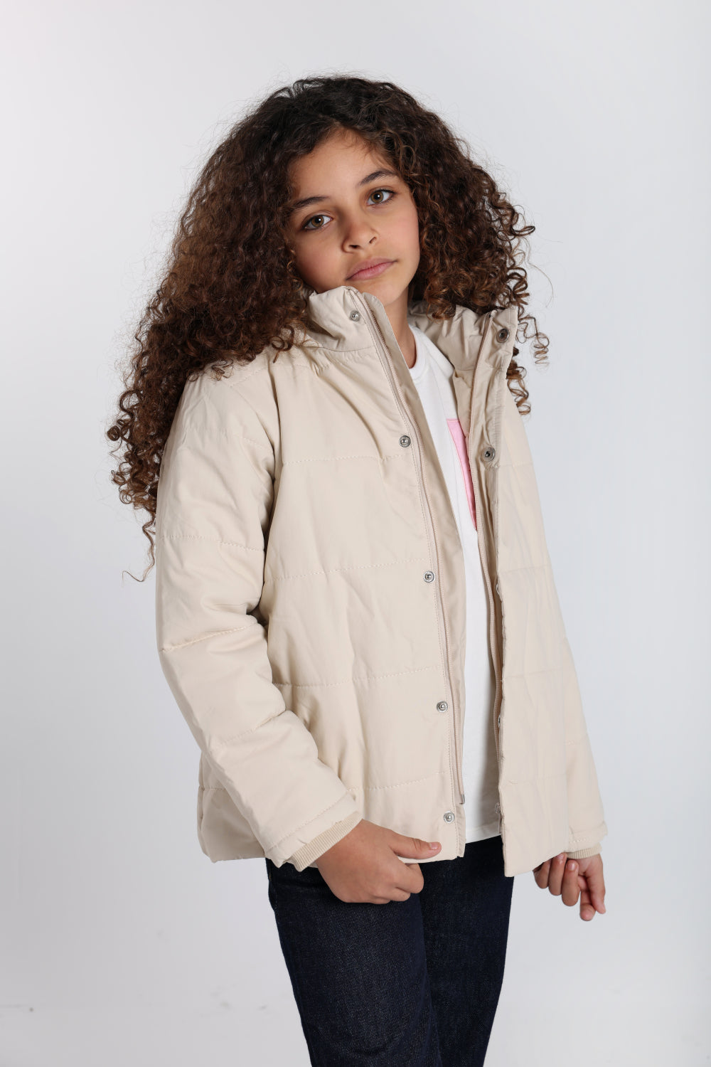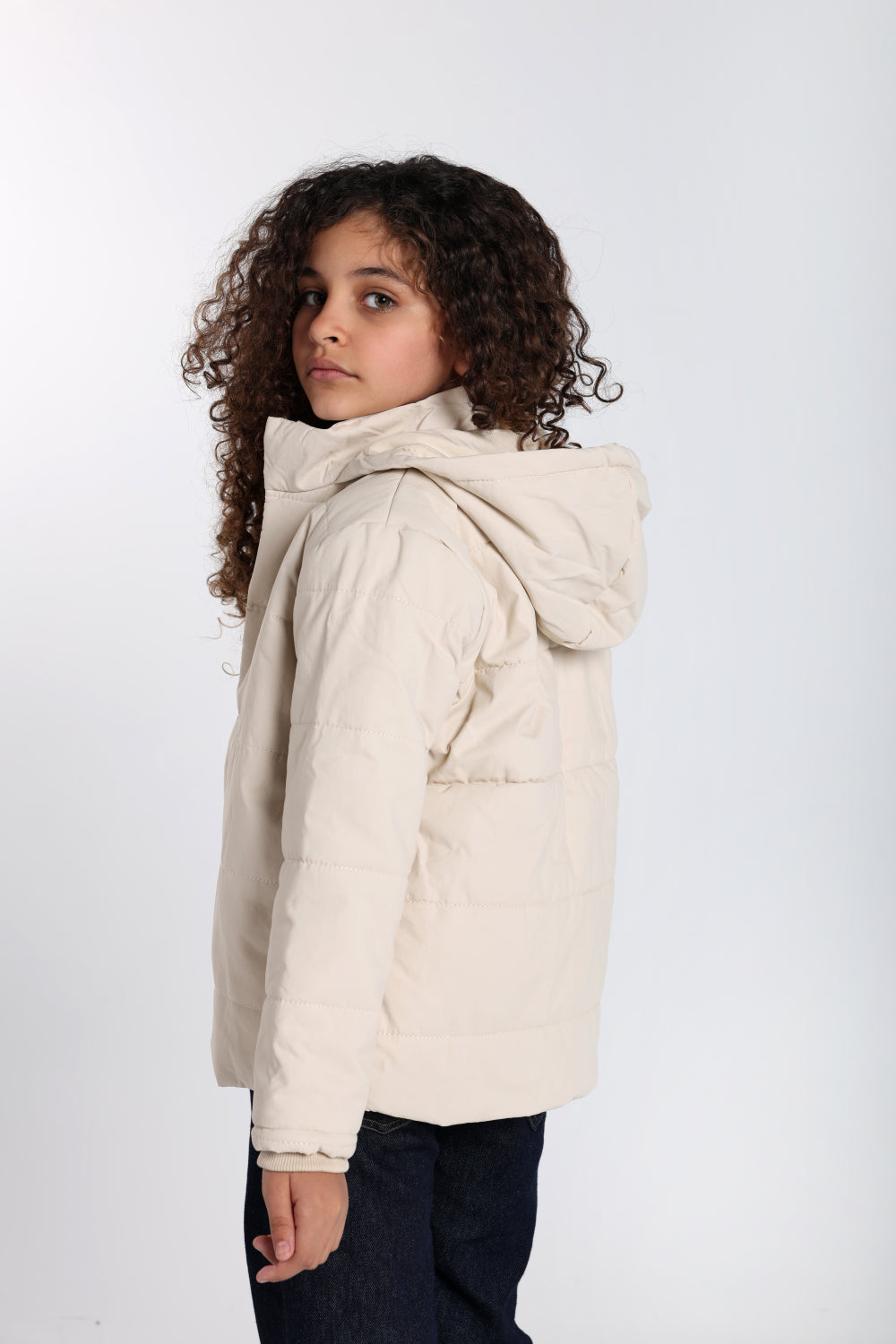 Keep your kids warm and cozy in our fleece lined puffer jacket! With a hood, long sleeves, a front zipper, snap button closures and printed fleeced lining.