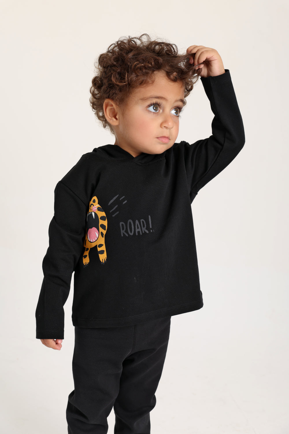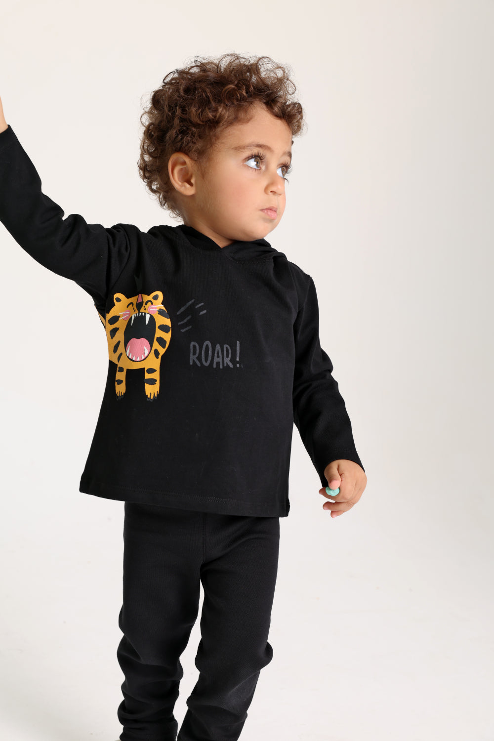 Let your little one show off his wild side with this Baby Boys Cotton Hooded T-Shirt in classic black, featuring a playful Little Tiger print. Made from soft, breathable cotton, it's designed for all-day comfort perfect for crawling, exploring, and napping in style. The attached hood and long sleeves add a cozy touch for cooler days.
