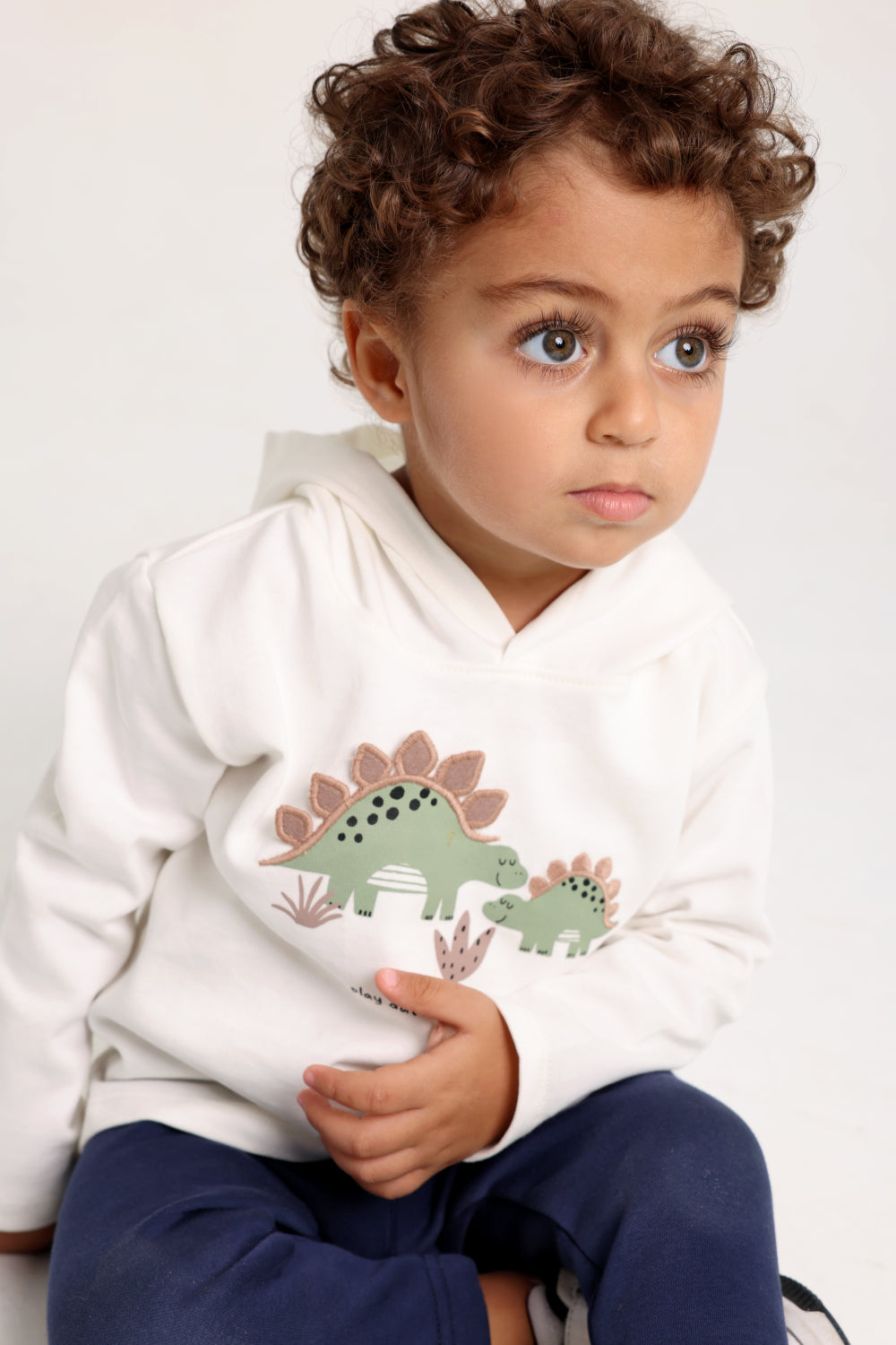 Add a roar of fun to his everyday look with this Cotton Hooded T-Shirt in soft off-white, featuring a playful Dino print that sparks little imaginations. Made from 100% breathable cotton, it’s lightweight, comfy, and perfect for all-day adventures or relaxed cuddles.