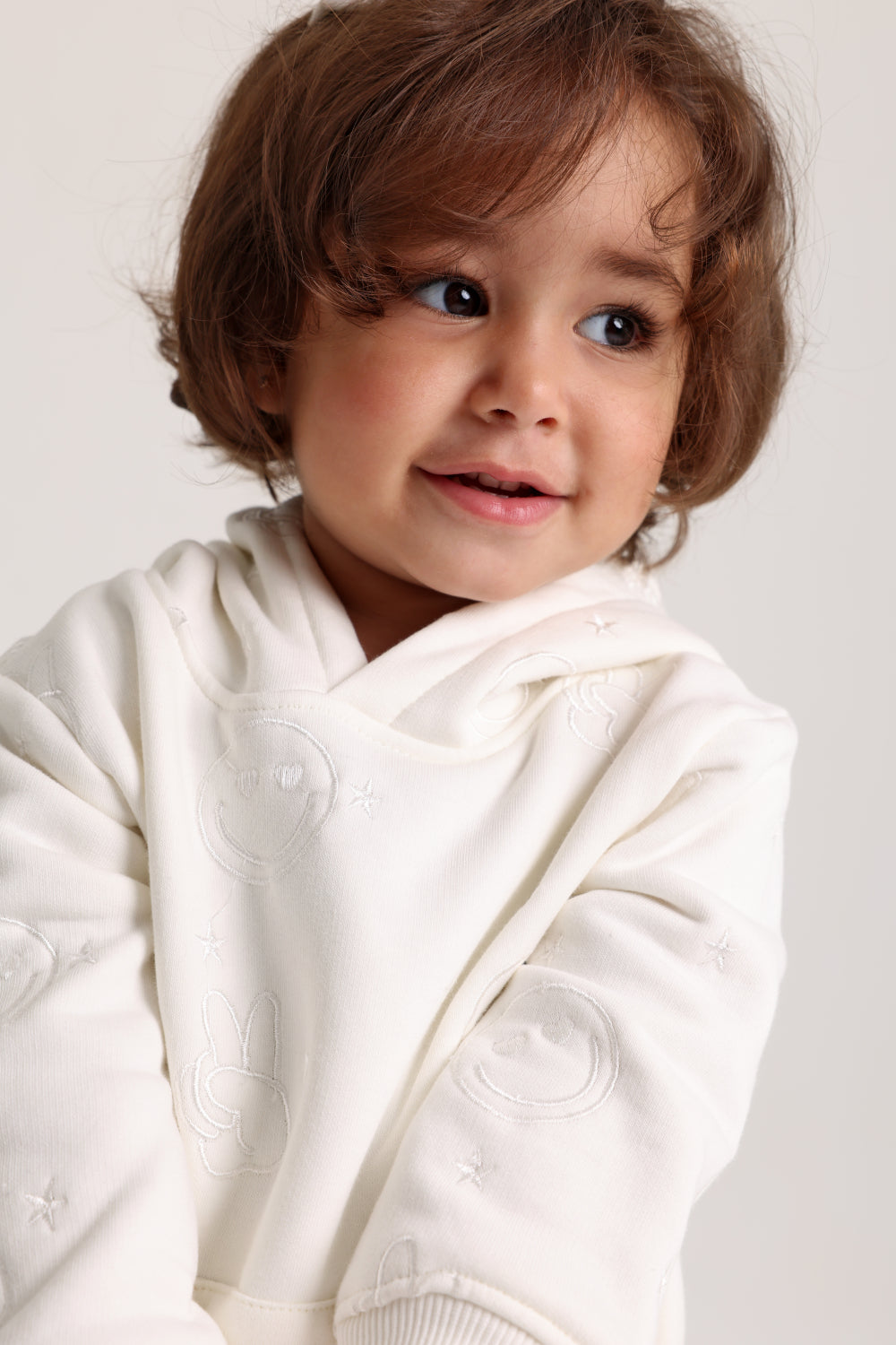 This adorable 2-piece set features soft cotton in a charming off-white tone, decorated with fun and playful Smiley Face prints. The oversized sweatshirt pairs perfectly with these sweatpants featuring an adjustable waistband, designed to keep her comfy, cozy, and irresistibly cute all day long.