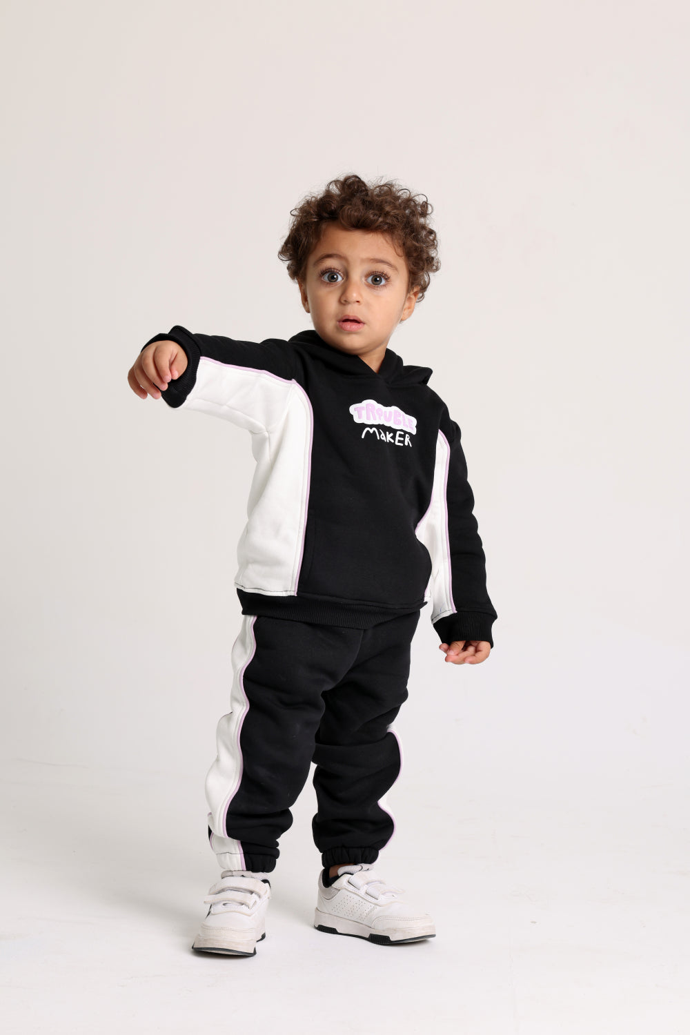 unisex cotton hoodie - black & offwhite with "trouble maker" print