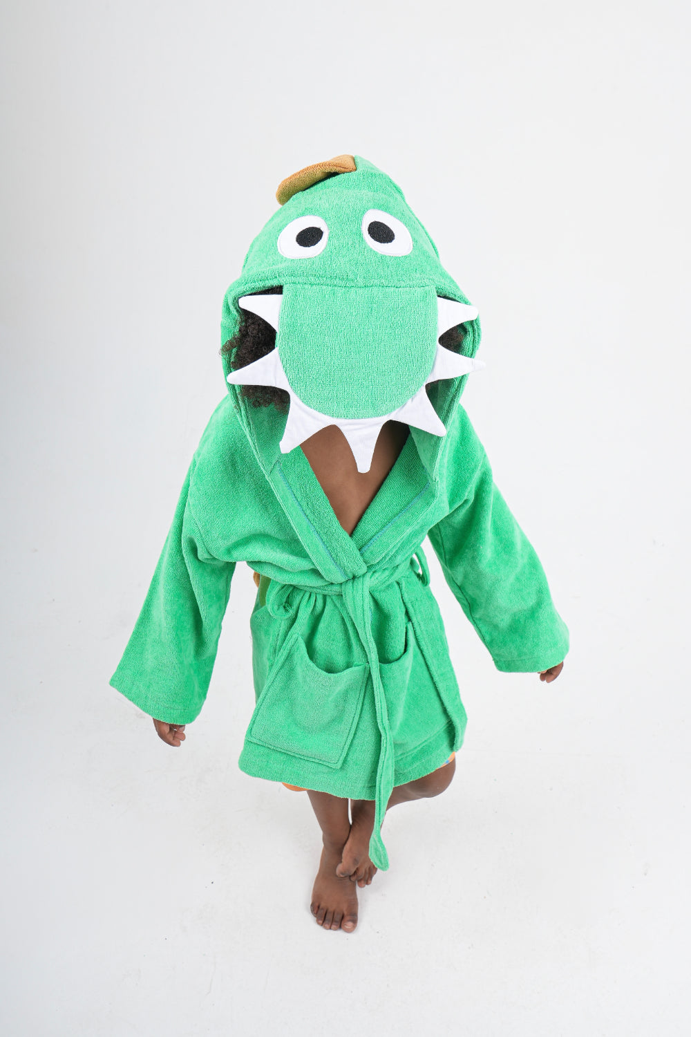 Turn drying time into fun time! This unisex plush swim robe features a playful green dinosaur design that kids will love. Made from soft, absorbent plush fabric, it keeps little ones warm and cozy after swimming or bath time.